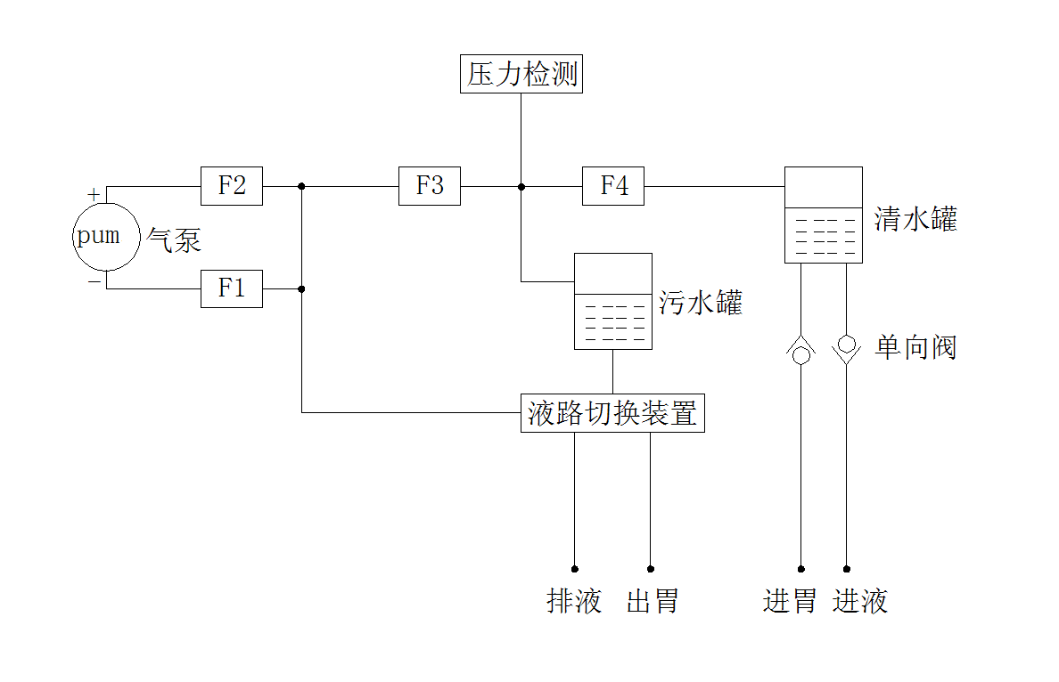 气泵的负压在F1的控制下驱动液路切换装置使出胃液管与污水罐管路连通,同时负压经F3连接压力检测单元以及污水罐的气控接口,清水罐的气控接口通过F4与负压相连,在负压动力作用下,清水罐、污水罐分别从清水液桶和胃内进行吸液,当压力达到设定值时,系统关闭负压并将气泵的正压在F2的控制下驱动液路切换装置使排液液管与污水罐管路连通,同时正压经F3连接压力检测单元以及污水罐的气控接口,清水罐的气控接口通过F4与正压相连,在正压动力作用下,清水罐、污水罐分别向胃内和污水集液桶内进行排液,当压力达到设定值时,系统关闭正压并重新开启负压,如此循环完成洗胃。