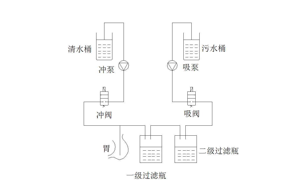 出胃过程:关闭冲阀,打开吸阀使吸泵与洗胃管的管路连通,在吸泵的作用下,胃内的食物及液体经一级过滤瓶(粗网)→二级过滤瓶(细网)→吸阀→吸泵(进口、出口)→污水桶。