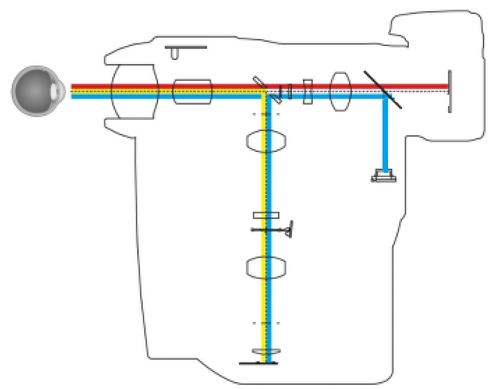 散瞳眼底照相机一般用于眼底荧光造影成像(FA)和脉络膜造影成像(ICG)检查。使用散瞳剂使患者瞳孔扩大,通过可见光的观察照明光对患者眼底进行观察和瞄准,利用可见光摄像闪光光源来拍摄、记录眼底,以供诊断各种眼底疾病。