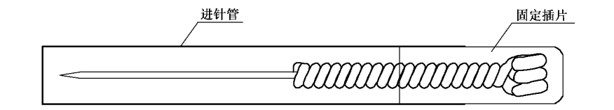 一次性使用无菌针灸针的型式分为带进针管和不带进针管两种,带进针管针灸针的型式如图3 所示 (进针管固定方式不作统一的规定)。已上市产品进针管配置方式有一针一管(如图3所示)、多针一管(如10支/包的包装规格中配置10支针灸针和一个进针管)。
