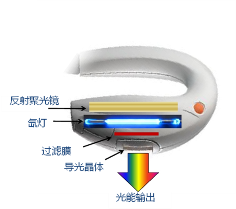 例如,强脉冲光设备的光源是氙灯,其基本工作原理是触发器对氙气施加高电压触发氙气电离,通过储能电容在相对较长时间的充电后,在极短的时间内放电,引起灯管内氙气雪崩式电离,氙气以高强度光辐射的形式将所充电能转化并释放,这个放电过程即是一个光脉冲。采用导光晶体上镀膜的方法滤除光谱,560治疗头导光晶体上所镀膜层可滤除短于560nm的波段,保留波长范围在560nm~1200nm之间的光谱。