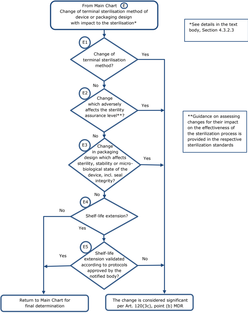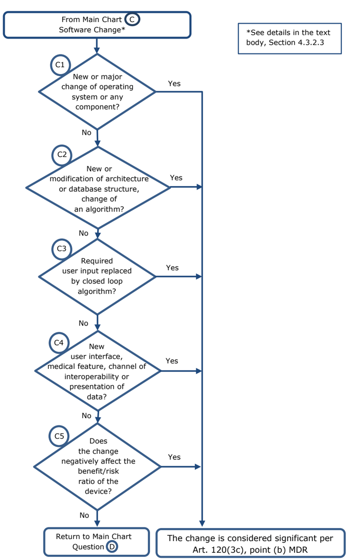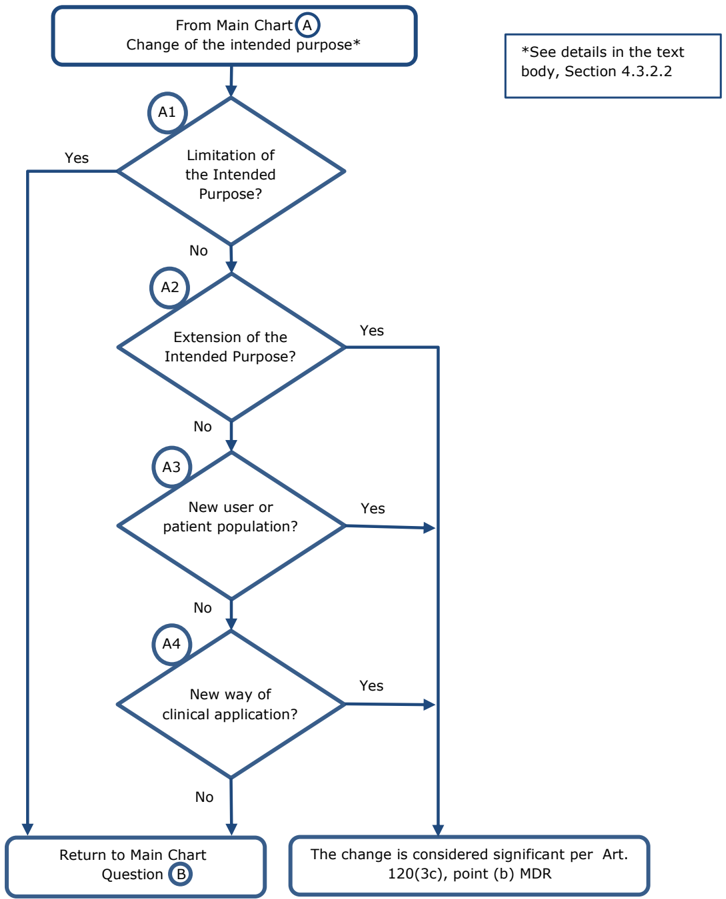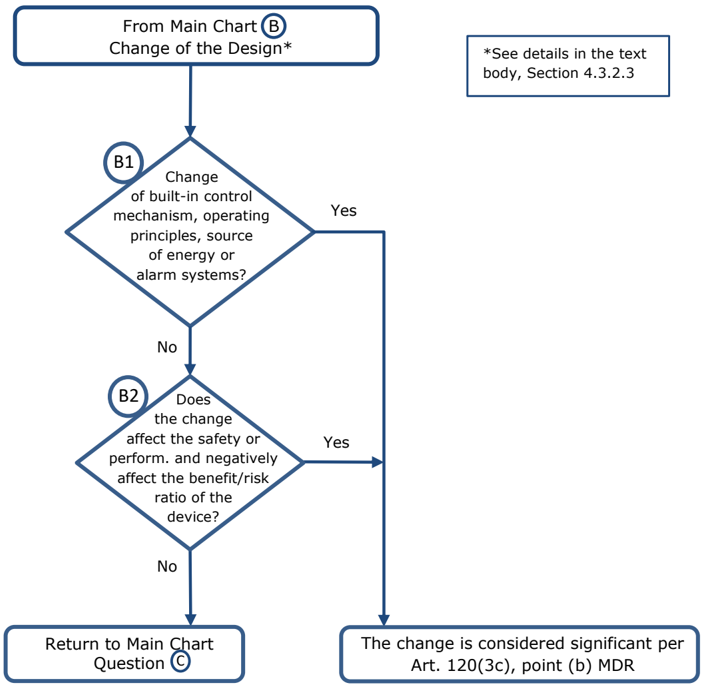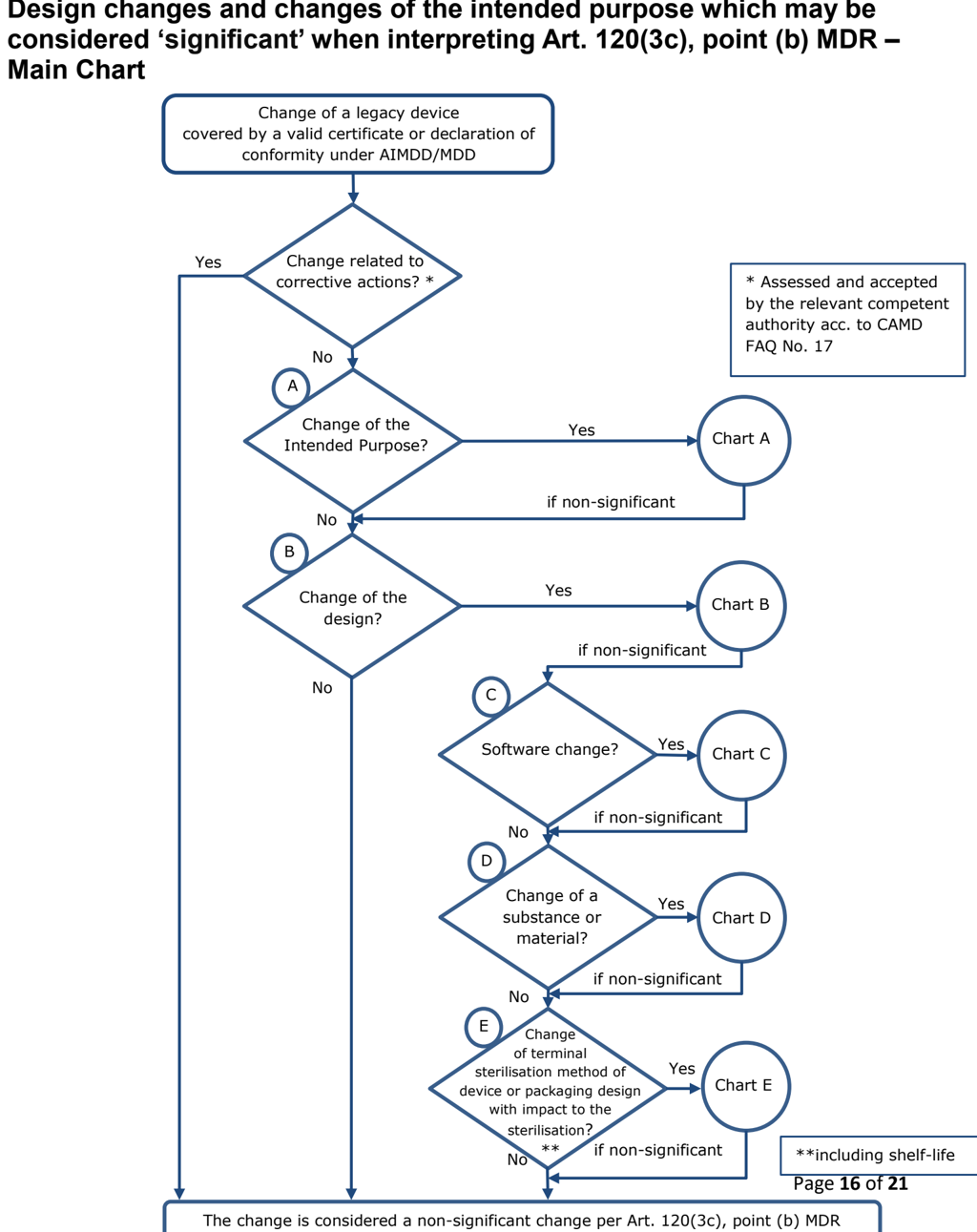 To facilitate a harmonised judgement of the significance of a change, this guidance document provides several flowcharts in the Annex . The assessment of a proposed change using the main flowchart and any of the applicable sub-charts is intended to assist manufacturers, notified bodies and market surveillance authorities in deciding whether or not a change of the design or intended purpose of the device is to be considered significant under Article 120(3c), point (b) MDR.