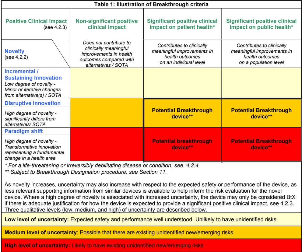 In certain circumstances, a medical device (MD) or in vitro diagnostic medical device (IVD) may be described as a breakthrough device (BtX) when it represents an innovation that is expected, based on available information, to offer a novel diagnostic or therapeutic option addressing an unmet medical need for a particular patient population with serious and lifethreatening diseases or conditions when compared with state of the art.