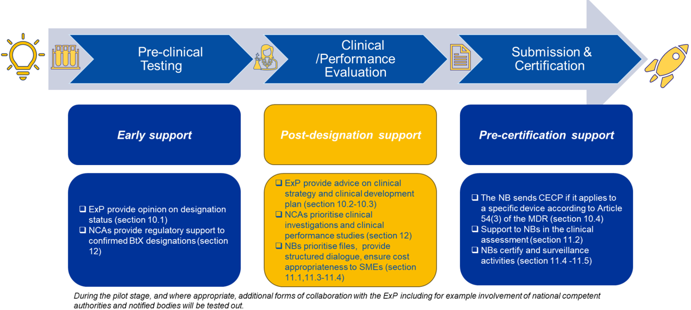 In alignment with the MDR and IVDR, this guidance presents recommendations for facilitating a streamlined pathway for CE marking and market access of breakthrough devices, to allow for timely patient access without compromising the clinical evidence requirements for these devices. It describes the opportunities and benefits available to manufacturers of BtX with the aim of eliminating undue delays and supporting the safe innovation and availability on the market of BtX. This document provides guidance for a process that accommodates the needs of these devices and provides considerations for the clinical or performance evaluation of breakthrough medical devices (BtMD) and breakthrough in vitro diagnostic medical devices (BtIVD) .