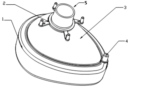 麻醉面罩可按材质、设计、技术参数、预期用途、辅助功能等不同分为若干型号及规格。典型麻醉面罩产品通常为带有单向阀的气囊结构,其结构示意图(图1)及实物照片(图2)如下所示: