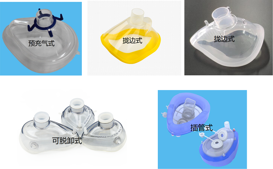 麻醉面罩可采用聚氯乙烯、聚丙烯、聚碳酸酯、硅橡胶、热塑性弹性体(如TPE、TPU)等适宜的高分子材料制成,通常由罩体、接头及气囊(或密封垫)组成,可配有挂钩和固定带。
