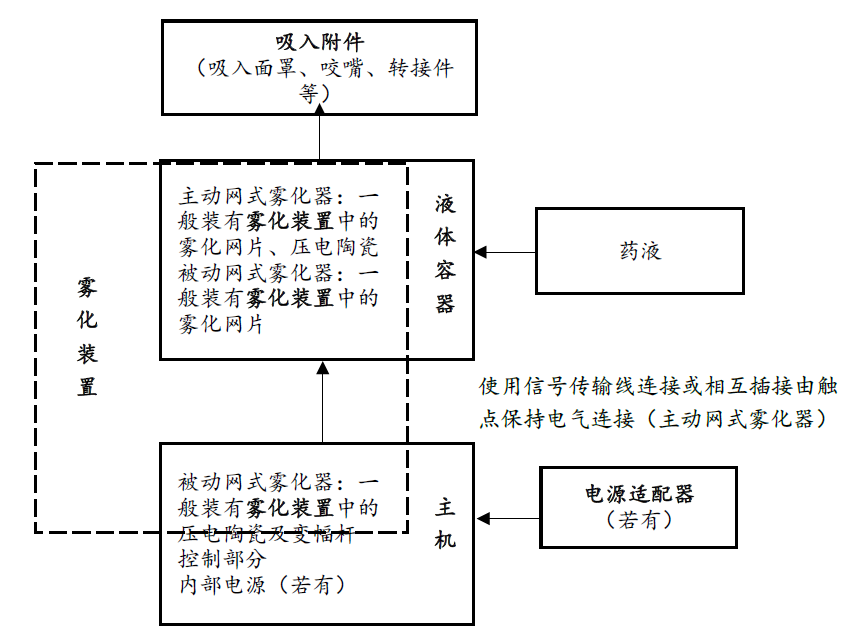 (1)产品由主机(含控制部分)、雾化装置(包含压电陶瓷、雾化网片及变幅杆(若有))、液体容器、电源适配器(若有)及吸入附件组成。产品的结构示意框图见图1。