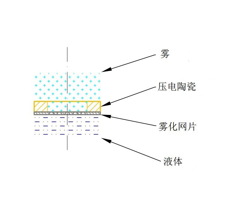 对雾化装置的产雾原理、物理特性及结构尺寸进行描述,如明确雾化网片的材质、网孔的数目,网孔沿轴向切面的形状尺寸,网孔区域的面积,网片的整体尺寸,压电陶瓷的整体尺寸,变幅杆的尺寸等。若产品具有雾化率调节功能,应描述其技术实现方法。