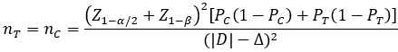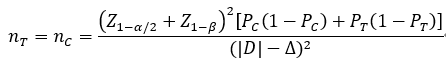 2. 若采用初检息肉检出率作为主要评价指标,A 组: 常规结直肠镜检查先进行组; B 组: AI 辅助检查先进行组。PC、 PT 分别为 A 组和 B 组预期初检息肉检出率,其中 PC=70%、 PT=80%;|D|为两组预期率差的绝对值, |D| = |PC – PT|; Δ 为优效性界值,取 0。主要评价指标为初检息肉检出率,其样本量估算公式为: