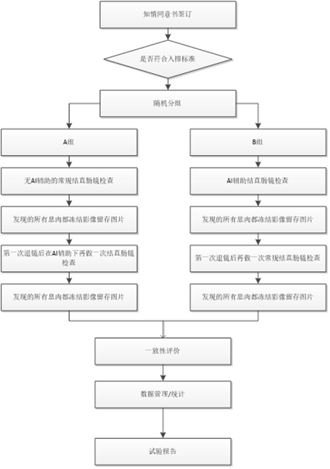 入组的受试者随机分配到A组和B组,A组:常规结直肠镜检查先进行组:先接受无 AI 辅助的常规结直肠镜检查,对检查过程中发现的所有息肉都冻结影像留存图片。第一次退镜后在AI 辅助下再做一次结直肠镜检查,对检查过程中发现的所有息肉都冻结影像留存图片。B 组:AI 辅助检查先进行组:先接受 AI 辅助的结直肠镜检查,对检查过程中发现的所有息肉都冻结影像留存图片。第一次退镜后再进行一次常规结直肠镜检查,对检查过程中发现的所有息肉都冻结影像留存图片。分别以各组两次检出的肠息肉作为基准,比较第一次检查时,有AI辅助检测和无AI辅助检测的病变检出能力。原则上,结肠息肉人工智能辅助检测产品临床试验需将前瞻性肠镜检查样本作为临床试验研究对象。