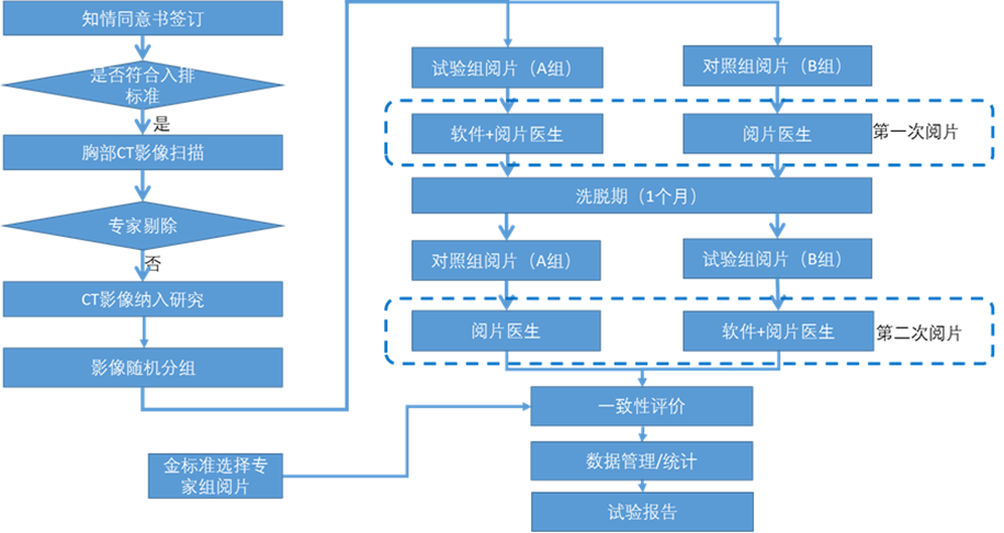 肺结节CT影像辅助检测产品采用MRMC设计、交叉自身对照设计或平行对照设计。平行对照设计的具体过程及方法参考《医疗器械临床试验设计指导原则》相关内容。