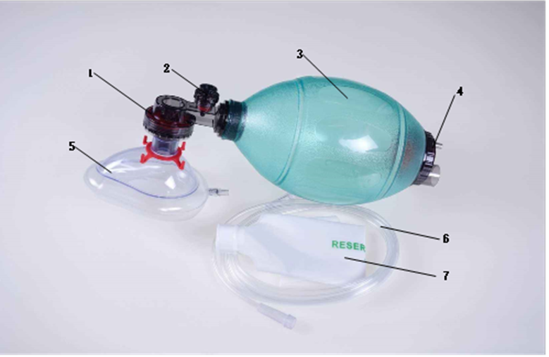 1-病人阀 ;       2-限压阀;      3-呼吸球囊;    4-进气阀组;5-面罩(选配);   6-氧气管(选配);   7-储气袋(选配)