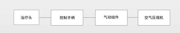 冲击波治疗仪一般由主机、控制手柄(内含子弹体)、治疗头和空气压缩机(一般包含在主机内)及相关附件组成。主机部分一般可包括控制电路(包括主板、电源模块、显示器等)、电磁阀、过滤器、安全阀和连接管路等,控制手柄可包括手柄主体、电磁阀、子弹体和弹道管、触发按钮和连接管路等。不同生产企业的产品,在结构上存在一定差异,可不完全与本部分描述一致。产品结构框图示例如下: