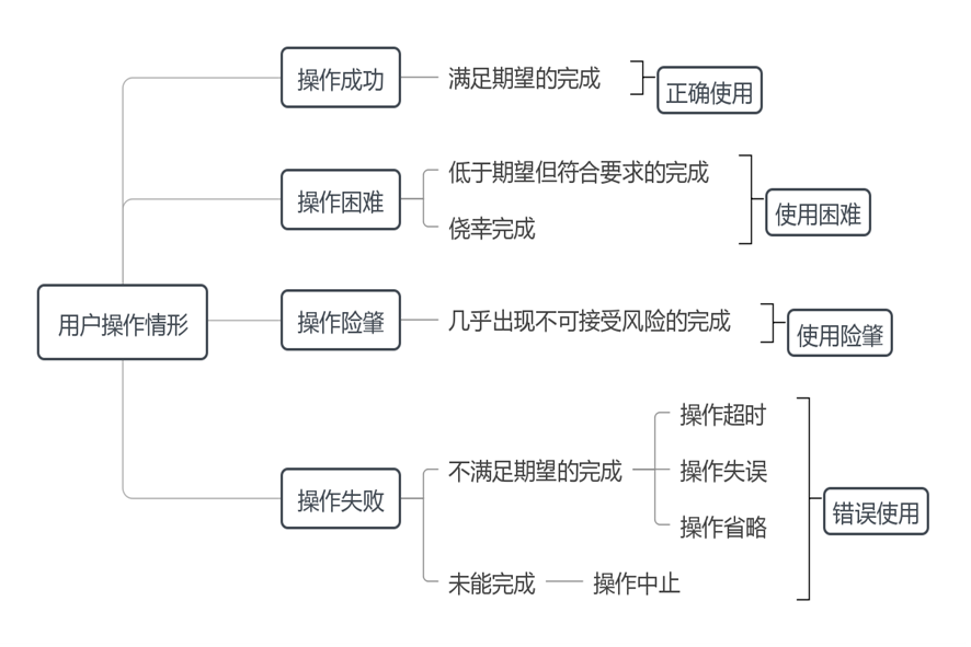 如图3所示,用户实际使用医疗器械的操作情形较为复杂,本指导原则根据操作任务完成程度将其分为操作成功、操作困难、操作险肇、操作失败。