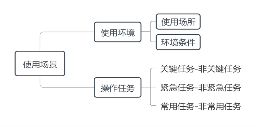 如图1所示,使用场景是指注册申请人所规定的医疗器械实际使用的场景因素,包括使用环境和操作任务。使用环境是指用户操作医疗器械的实际环境,又可分为使用场所、环境条件,其中使用场所包括门诊室、急诊室、手术室、病房、救护车、家庭、公共场所等情况,环境条件包括空间、照明、温度、湿度、气压、洁净度、噪声、振动、辐射等情况。操作任务是指用户操作医疗器械以实现特定目标的行动或行动序列,本指导原则重点关注医疗活动相关操作任务,暂不考虑清洁、运输、安装、维护、维修、处置等操作任务(医疗器械安全标准若有相应要求除外),待时机成熟时纳入考量。不过注册申请人需考虑全部操作任务的可用性要求。